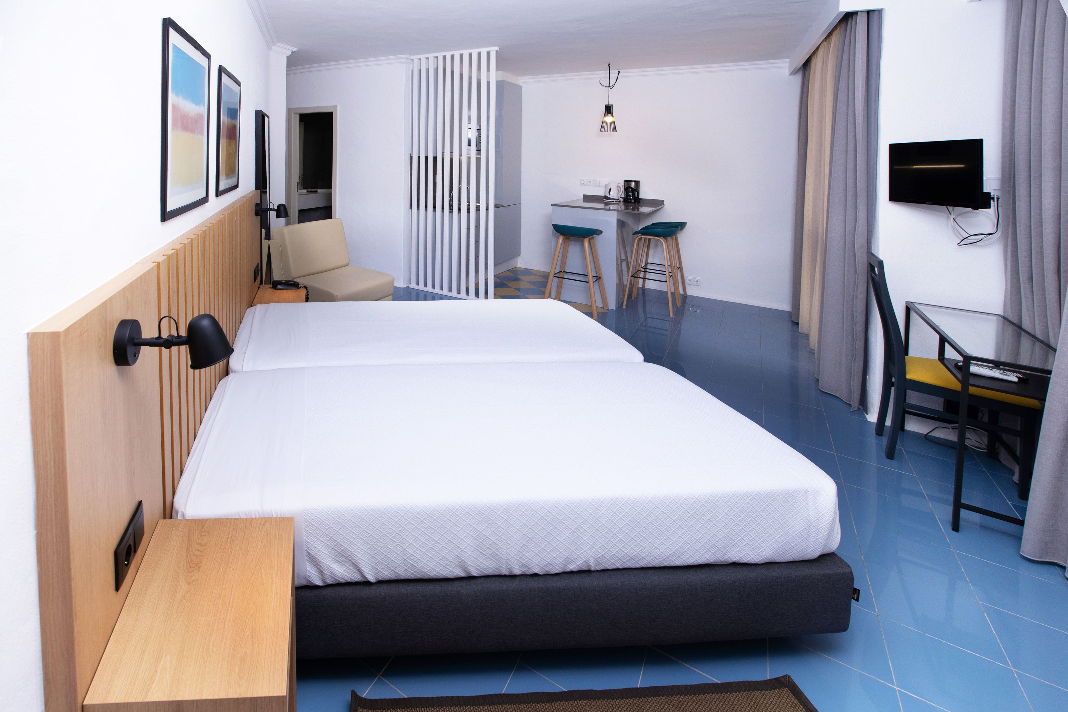 • disponibiliza 12 estúdios sem varandas, 18 T1 com varandas e 6 T2 ou T3 com varandas, dispondo alguns apartamentos com vista mar e todos equipados com: